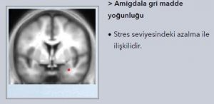 Meditasyon yapan kişilerin stres seviyelerinde azalma ,depresyon, kaygı bozukluğu ve uykusuzluğa ait semptomlarda düşüş gözlendi.Bedenimizin tehdit algılama sistemi olarak bilinen amigdalada – amigdalanın büyümesi stres artışıyla ilişkili – 8 haftalık meditasyon programının sonunda amigdalanın ebadı küçüldü. (Depresyonda olan kişiselerin amigdalalarının boyutları daha büyüktür, yani stres azaldıkça amigdala küçülür.)